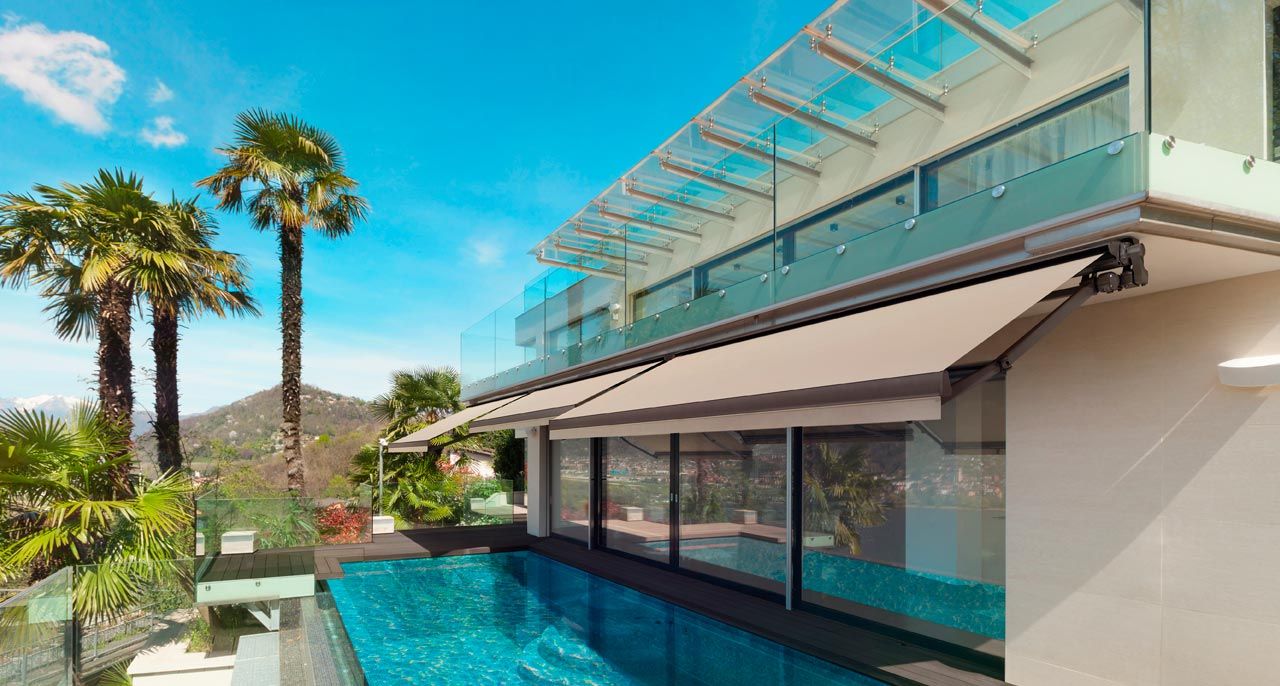Slide to change the awning from full cassette closed position to fully open to see the shade difference.